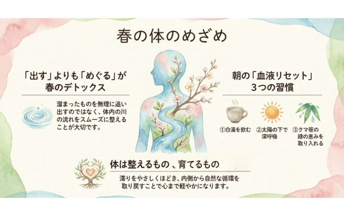 体の中に川があるとしたら、ゴミを拾うことよりも、川の流れそのものを取り戻すこと。血液やリンパがスムーズに流れれば、老廃物は自然と運ばれていきます。「出す」よりも「めぐる」。この発想が、春のセルフケアではとても大切なのです。
